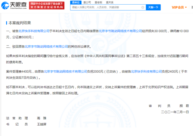 新浪科技讯 8月6日上午消息,天眼查App显示,8月5日,北京字节跳动网络技术有限公司与北京快手科技有限公司侵害作品信息网络传播权纠纷一审民事判决书公开,审理法院为北京互联网法院。
