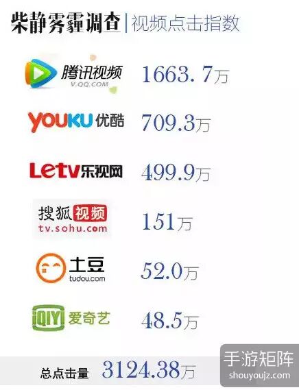 柴静的《穹顶之下》一出,就在矩叔的朋友圈里面炸开了,这种传播其实在之前的几天里面也有,无论是那条破裙子,还是duang,或者是跳舞的小白熊,都不能和这条的传播影响力抗衡,原因很简单,因为当《穹顶之下》出来之后,其它的东西都已经消失无踪了。截止2015年3月1日零点,传媒大观察统计了优酷、腾讯视频等各大主流视频网站数据,该调查视频点击率已经突破3100万次。